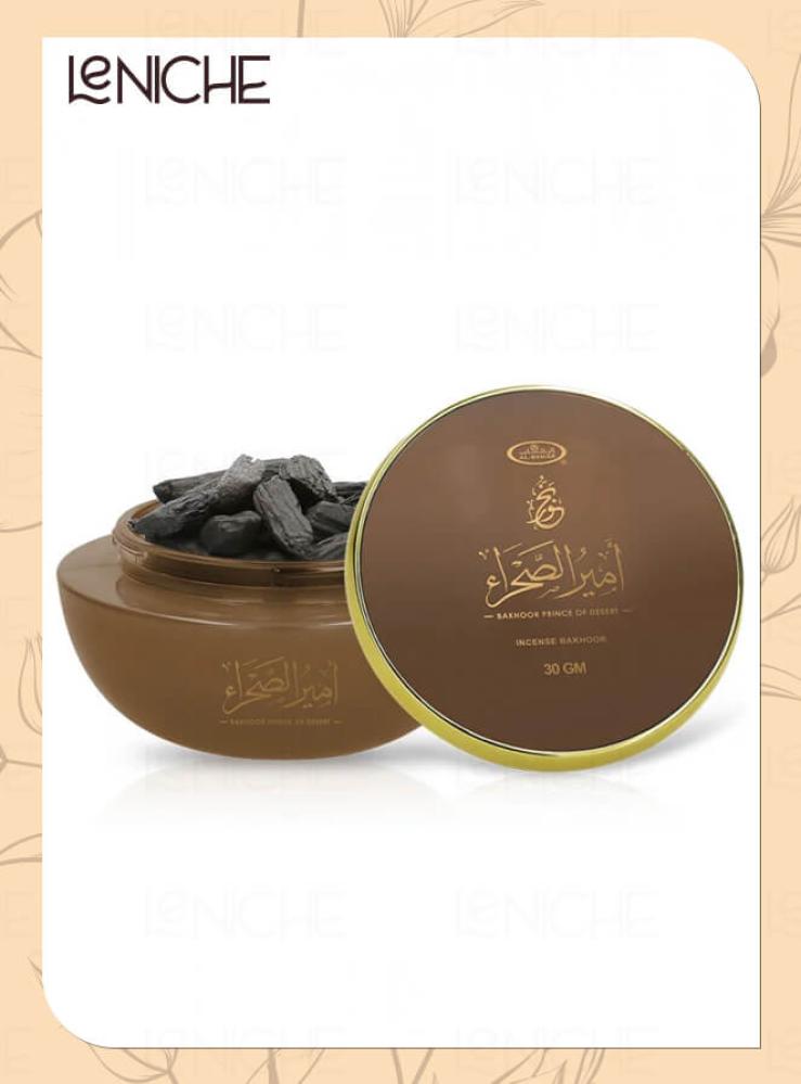 بخور أمير الصحراء مستوحى من رائحة الصحراء العربية من مجموعة الرحاب توليفة خشبية دافئة مليئية بالسكون ، مقدمة من خشب الصندل بلمسة شرقية ساحرة ، توهج في وسط التركيبة من أخشاب العنبر لتنتهي بلمسة رقيقة من الزعفران .